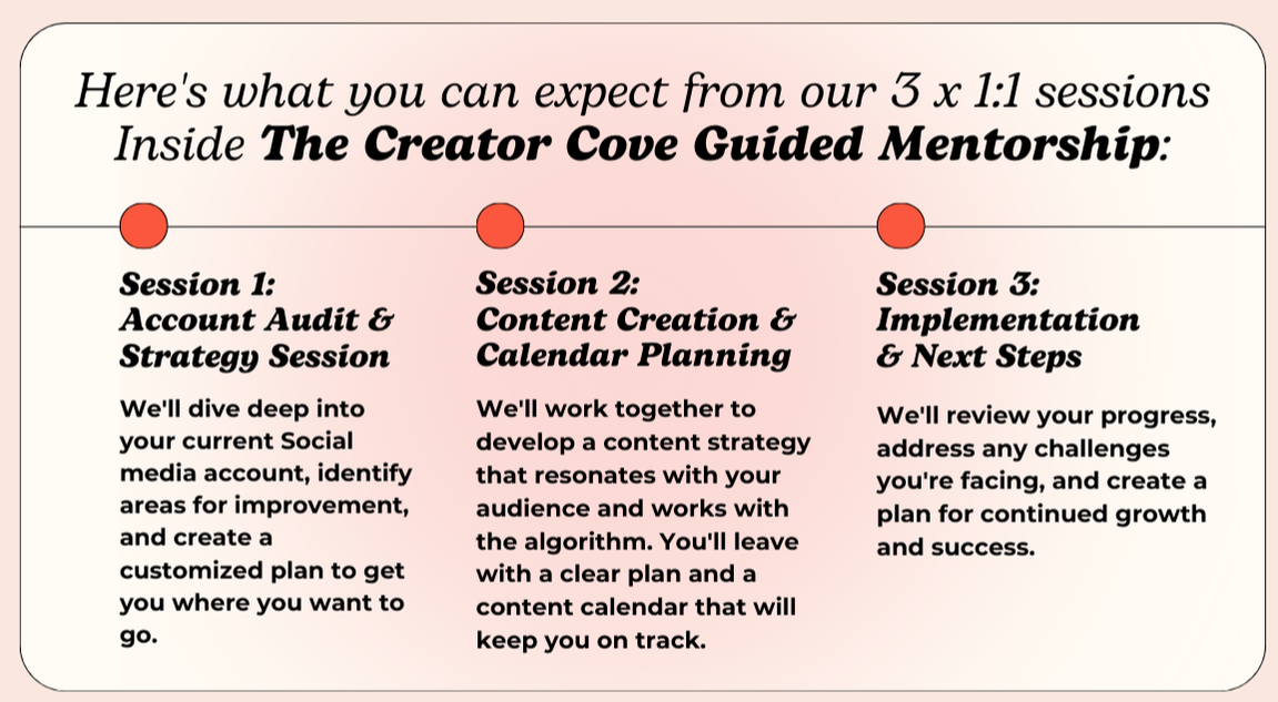 I'm excited to offer a limited number of spots in my Creator's Cove: Guided Mentorship & Growth package. This 1:1 program is designed to help you: